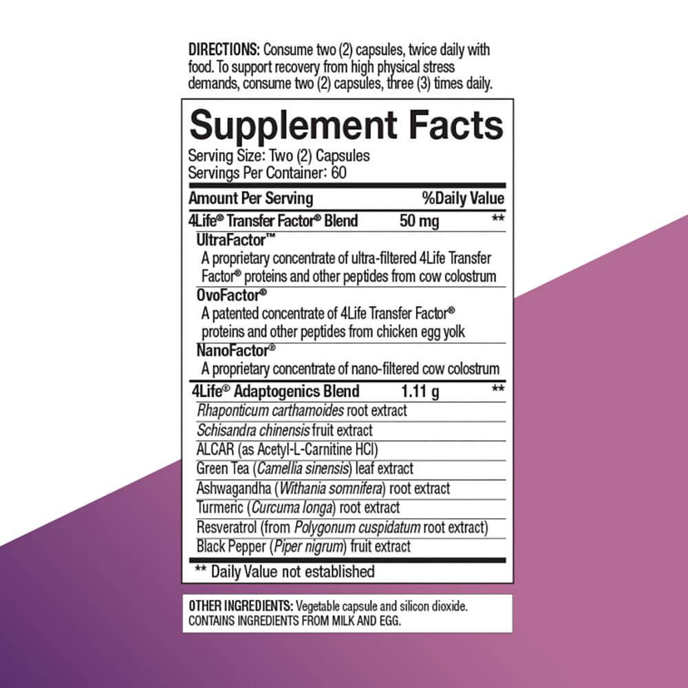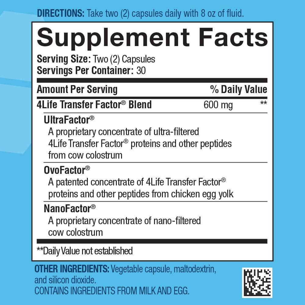 Con cuatro (4) cápsulas de Transfer Factor Plus obtienes tu dosis diaria y maximizas los beneficios inmunológicos para tu cuerpo, ya que se ha comprobado clínicamente que una dosis diaria de 600 mg de 4Life Transfer Factor activa el sistema inmunológico en el transcurso de dos horas.*1 4Life Transfer Factor Plus Tri-Factor Formula viene en cápsulas de origen vegetal.